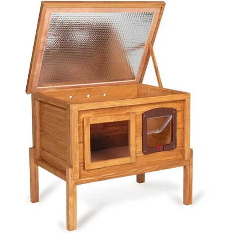 Votre chat aime se balader à l’extérieur mais attire souvent votre attention pour rentrer ? Offrez-lui cette niche autochauffante conçue en bois. Grâce à un revêtement isolant au niveau du toit, l’abri protège votre animal du froid et des intempéries. Fabriquée en bois et surélevée sur ses 4 pieds, la niche est positionnée à 22 cm du sol de façon a bien abriter votre animal de compagnie de l’humidité. Le revêtement extérieur de son toit est en asphalte de couleur verte ce qui lui permet d’être étanche en cas de pluie. L’abri est également équipé d’une double isolation au niveau du toit intérieur. La doublure en aluminium et son rembourrage coton permettent une excellente conservation de la chaleur. Votre chat peut donc se nicher dès qu’il en a envie dans cet abri extérieur tout en étant protégé du froid et de l’humidité. Facile à installer et ergonomique, la niche propose une porte d’entrée sous forme de porte à battant verrouillable (2 positions : fermée – ouverte). Pour une ambiance encore plus cocooning, votre chat pourra profiter d’une fenêtre en plexi afin de contempler vos extérieurs. Pour une meilleure circulation de l’air, l’abri en bois dispose de 3 trous d’aération de 1 cm de diamètre situés à l’arrière. Astuce ID Market : lors de l’installation, pensez à décoller la fine pellicule qui protège la fenêtre en plexiglas. Dimensions de la niche chauffante pour chat – Dimensions totales : Longueur 70 CM x largeur 51,5 CM x Hauteur 60 CM (avec pieds)- Dimensions de la maisonnette : L. 70 x l. 51,5 x H. 38 CM- Hauteur des pieds : 22 CM- Dimensions de la fenêtre : 21 x 18 CM- Dimensions de la trappe à battant : 15 x 15 CM- Diamètre des trous d’aération (x3) : 1 CM- À monter soi-même