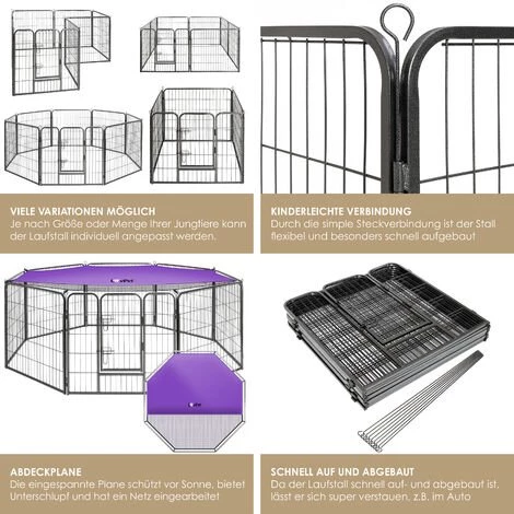 L’enclos pour chiots, fabriquĂ© en fil de mĂ©tal robuste et en tube carrĂ© renforcĂ©, peut ĂŞtre utilisĂ© de diffĂ©rentes manières. Le parc Ă chiots offre suffisamment d’espace libre pour que vos chiots, lapins et petits animaux domestiques puissent jouer, dormir ou se blottir. Montage facile grâce aux connexions pratiques des barres. Porte avec double verrouillage. Les barres de connexion peuvent ĂŞtre enfoncĂ©es dans le sol pour plus de stabilitĂ©. Pliage et rangement peu encombrants. Plusieurs formes de construction possibles (octogone, rectangle, carrĂ©).Â