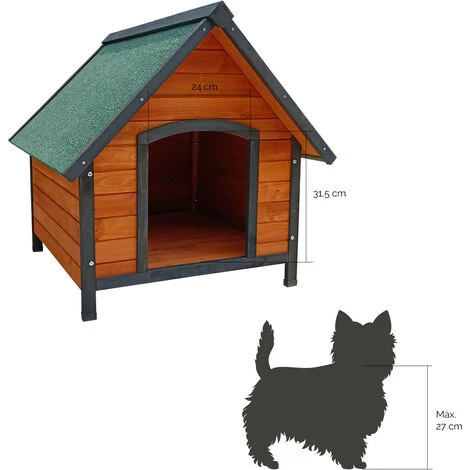 Solide niche en bois de pin massif. Indiqué pour l’extérieur avec un revêtement d’asphalte qui protégera l’animal des intempéries. Placez la maison dans la zone du patio ou du jardin de votre choix et offrez à votre chien un endroit pour s’abriter et se détendre.