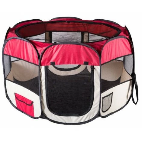Parc-enclos peu encombrant pour animaux domestiques Parc-enclos en tissu, pliant, pour chiens et chats ou autres animaux domestiques. Idéal pour être utiliser à l’intérieur mais pratique aussi pour l’extérieur.Des filets latéraux permettent à l’air de circuler correctement, tout en vous laissant une excellente visibilité sur vos amis à 4 pattes.Très léger, très facile à monter et démonter, il suffit de quelques secondes.Livraison gratuite.Caractéristiques techniques du parc pliable pour chiens et chats. Filet de sécurité résistant équipe le haut du parc pour empêcher les sauts en dehors de votre fidèle compagnon.Fabriqué en tissu très résistantNettoyage et pliage facile Peu encombrant quand il est plié.Sac de transport très pratique en dotation Il dispose d’une poche porte-objets pour croquettes, colliers, brosses ou jouets Doté de 4 piquets en métal chromé pour ancrage au sol Double porte qui s’ouvre à l’aide de zipCaractéristiques techniques du parc en tissu pour animaux domestiques Couleur: rouge-beigeDimensions: Longueur maximun 115 cmHauteur 61 cmOuverture porte : 37cm x 40cm