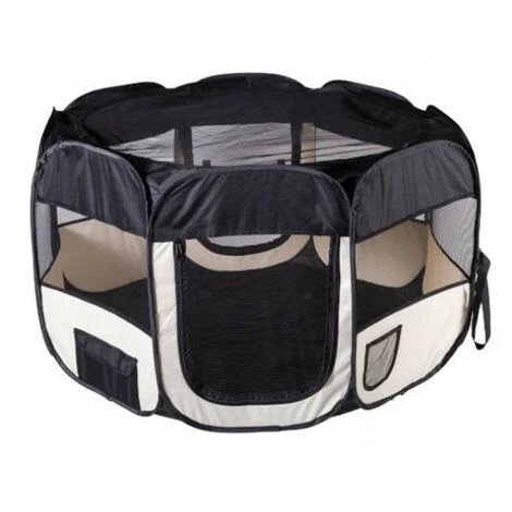Parc-enclos peu encombrant pour animaux domestiques Parc-enclos en tissu, pliant, pour chiens et chats ou autres animaux domestiques. Idéal pour être utiliser à l’intérieur mais pratique aussi pour l’extérieur.Des filets latéraux permettent à l’air de circuler correctement, tout en vous laissant une excellente visibilité sur vos amis à 4 pattes.Très léger, très facile à monter et démonter, il suffit de quelques secondes.Livraison gratuite.Caractéristiques techniques du parc pliable pour chiens et chats. Filet de sécurité résistant équipe le haut du parc pour empêcher les sauts en dehors de votre fidèle compagnon.Fabriqué en tissu très résistantNettoyage et pliage facile Peu encombrant quand il est plié.Sac de transport très pratique en dotation Il dispose d’une poche porte-objets pour croquettes, colliers, brosses ou jouets Doté de 4 piquets en métal chromé pour ancrage au sol Double porte qui s’ouvre à l’aide de zipCaractéristiques techniques du parc en tissu pour animaux domestiques Couleur: noir-beigeDimensions: Longueur maximun 115 cmHauteur 61 cmOuverture porte : 37cm x 40cm